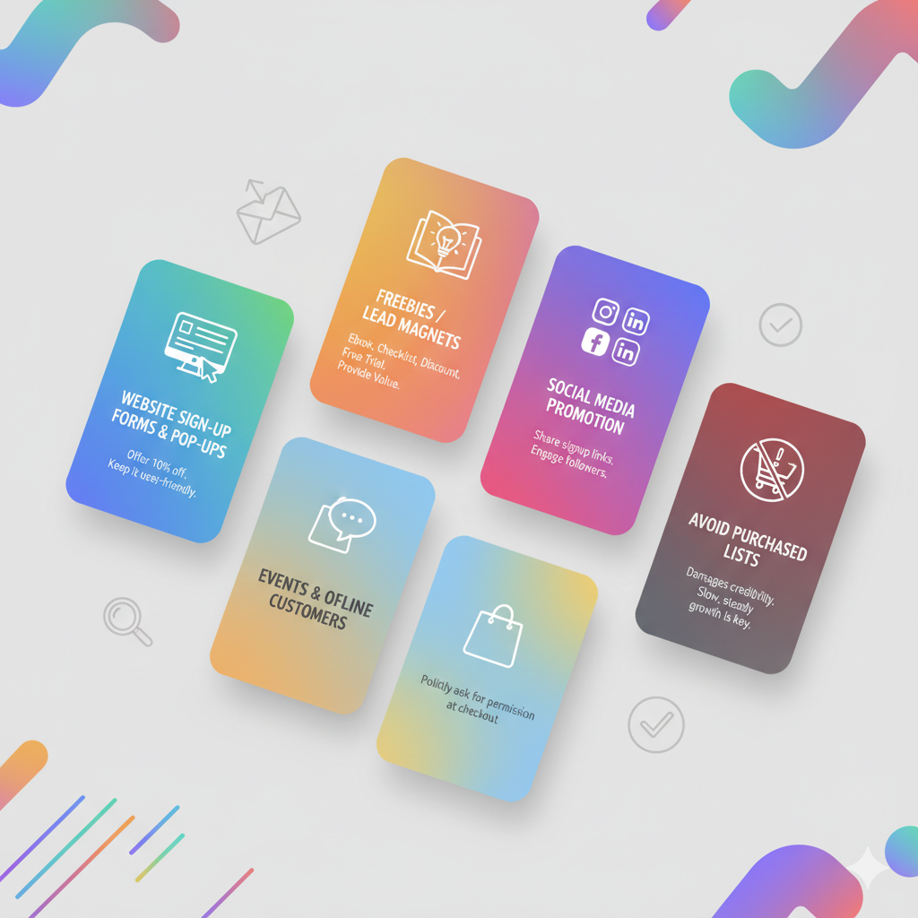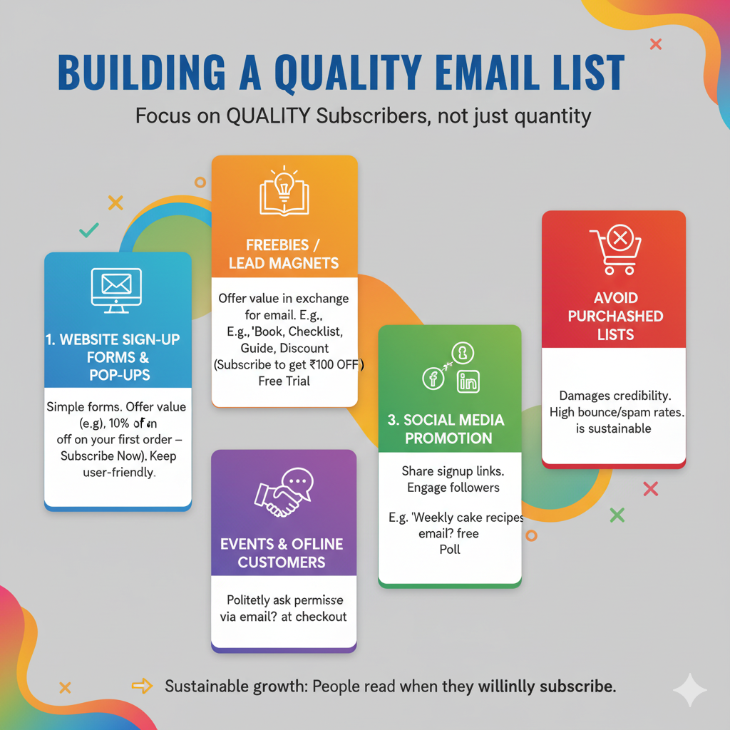 Website signup forms, social media promotions और freebies (eBooks, coupons) lead magnets की मदद से organically list grow करें। Purchased lists से बचें।