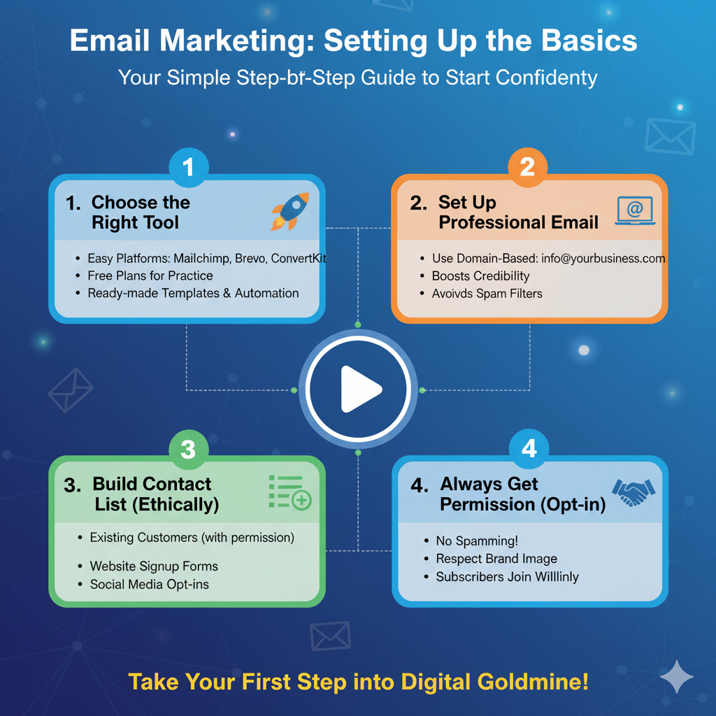 Basics से शुरू करें – एक email marketing tool (जैसे Mailchimp, Brevo) चुनें, professional email ID बनाएं और quality email list तैयार करें।